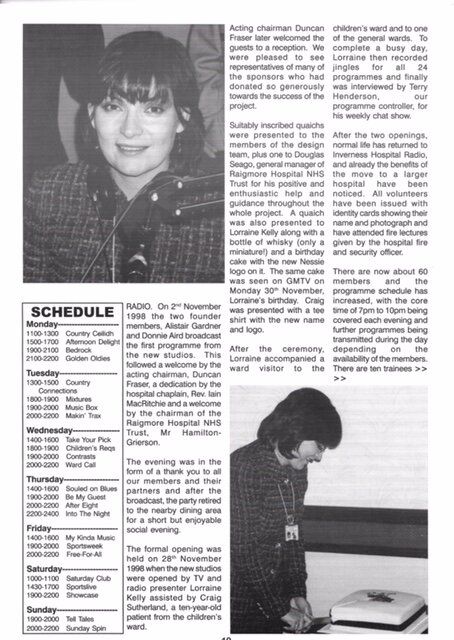 Lorraine Kelly of GMTV helped the organisation by opening the studios in the company of the members and many invited guests. Lorraine again attended a memorable 30th anniversary of Hospital Radio in November 2000 by joining in the celebrations at a dinner in the Town House, Inverness and handing out Long Service Awards to members. Shortly after this, she accepted an invitation to become the Patron of Inverness Hospital Radio and has been closely associated with the organisation since. Lorraine participates in a telephone recorded interview to her home on a regular basis.