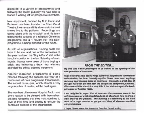 Five years later in 1975, a small room in the RNI became the first studio of Radio Inverness, the name at that time, As the years went by, the status of the hospitals began to change and the main hospital for patients in the area became Raigmore Hospital. After years of fundraising and helped by many donations from local businesses, in particular Highland Cross 1997 and the North British Hotels Trust along with a lot of hard work by the members, the new studios at Raigmore Hospital were opened in 1998.